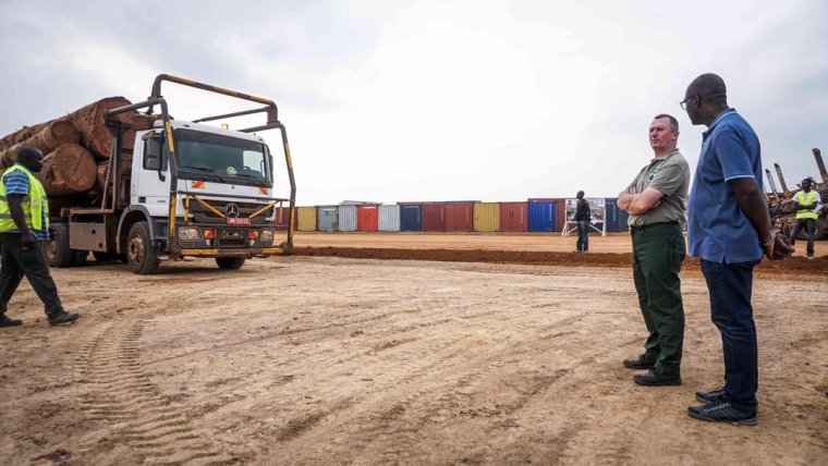 Le ministre de la Forêt, de la Mer, de l’Environnement, chargé du plan climat, Prof. Lee White s’est rendu au Parc à bois des eaux et forêts situé dans la Zone économique spéciale (ZES) de Nkok pour observer le déchargement de conteneurs de Kevazingo saisis au port d’Owendo sur les sites de 3C Transit et SOTRASGAB.