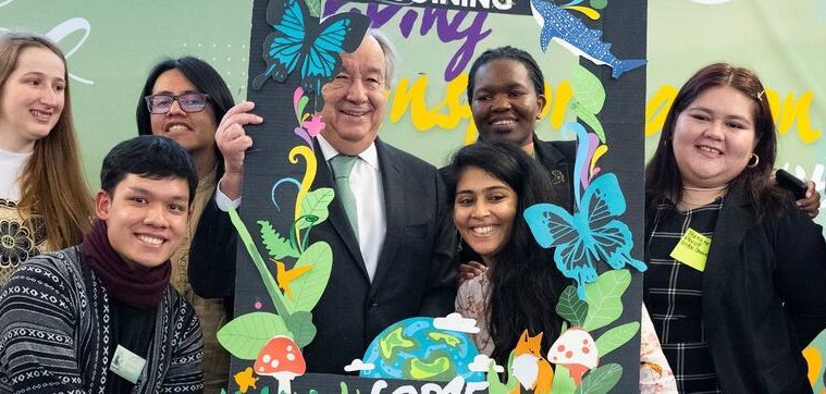Plus tôt dans la journée, le Secrétaire général a assisté à l’une des manifestations parallèles organisées par le Réseau mondial des jeunes pour la biodiversité (Global Youth Biodiversity Network) et d’autres groupes de jeunes.