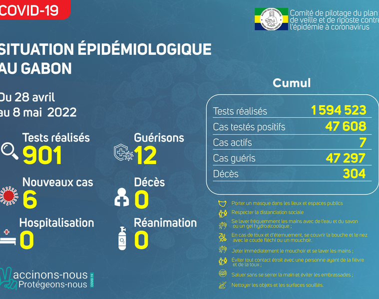Le Gabon a enregistré 06 nouveaux cas positifs sur 901 tests réalisés, soit un taux de positivité de 0.7%, 00 personne hospitalisée dont 00 en réanimation, 12 nouvelles guérisons et 00 nouveau décès.