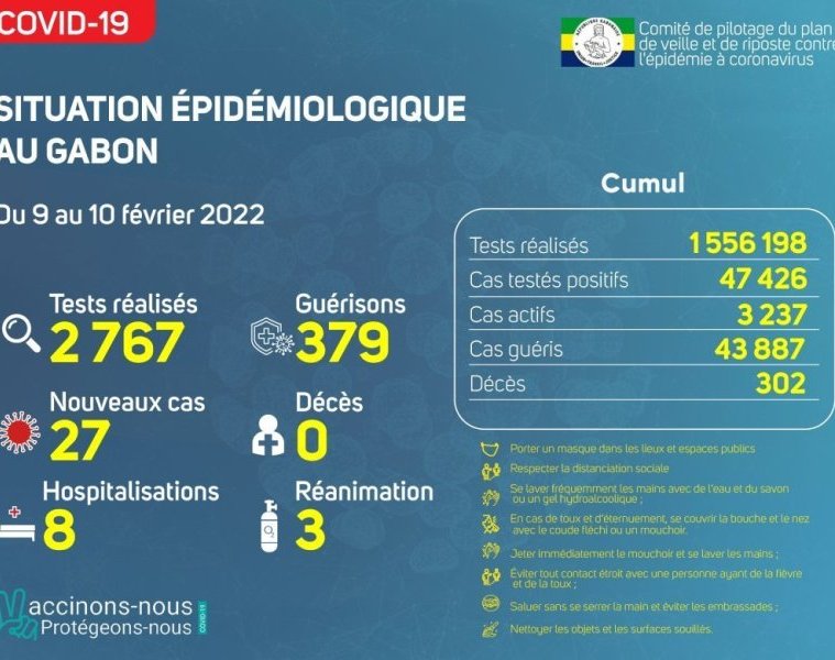 GabonMatin vous livre le point journalier du Comité de pilotage du plan de veille et de riposte contre l’épidémie à Coronavirus au Gabon du 10 février 2022.
