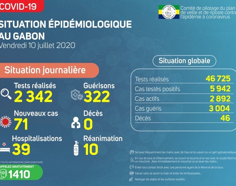 Gabon Matin vous livre le point journalier du Comité de pilotage du plan de veille et de riposte contre l’épidémie à Coronavirus au Gabon du 10 juillet 2020.