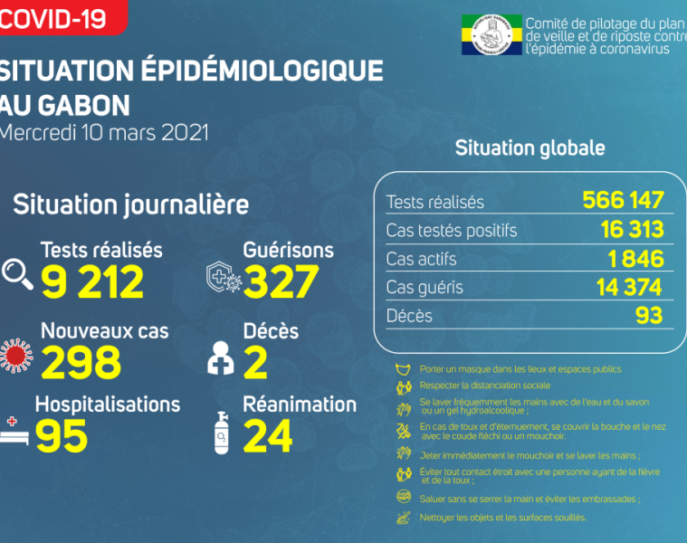 Gabon Matin vous livre le point journalier du Comité de pilotage du plan de veille et de riposte contre l’épidémie à Coronavirus au Gabon du 10 mars 2021.