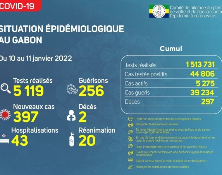Nous avons enregistré 397 nouveaux cas positifs sur 5 119 tests réalisés, soit un taux de positivité de 7.7%, 43 personnes hospitalisées dont 20 en réanimation pour détresse respiratoire, 256 nouvelles guérisons et 02 nouveaux décès à Libreville.
