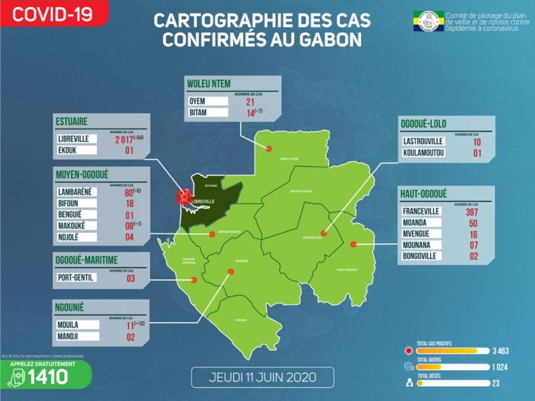 - Moyen-Ogooué : 7 nouveaux cas sur 27 prélèvements dont 6 à Lambaréné et 1 à Makouké, soit un total de 111 cas positifs ;