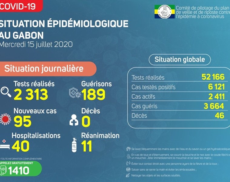 Gabon Matin vous livre le point journalier du Comité de pilotage du plan de veille et de riposte contre l’épidémie à Coronavirus au Gabon du 15 juillet 2020.