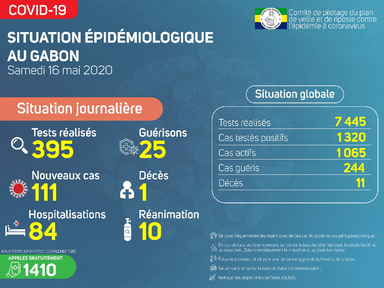 Gabon Matin vous livre le point journalier du Comité de pilotage du plan de veille et de riposte contre l’épidémie à Coronavirus au Gabon du 16 mai 2020.