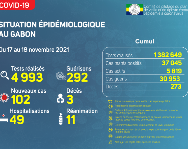 Gabon Matin vous livre le point journalier du Comité de pilotage du plan de veille et de riposte contre l’épidémie à Coronavirus au Gabon du 18 novembre 2021.