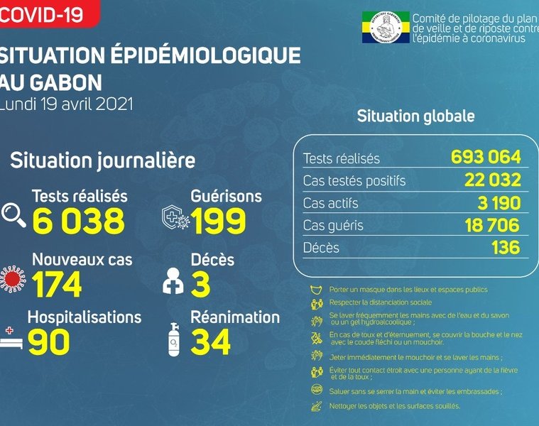 Nous avons enregistré 174 nouveaux cas positifs sur 6 038 tests réalisés, soit un taux de positivité de 2.9%, 90 personnes hospitalisées dont 34 en réanimation pour détresse respiratoire, 199 nouvelles guérisons et 03 nouveaux décès dont 02 notifiés à Libreville et 01 à Lambaréné.