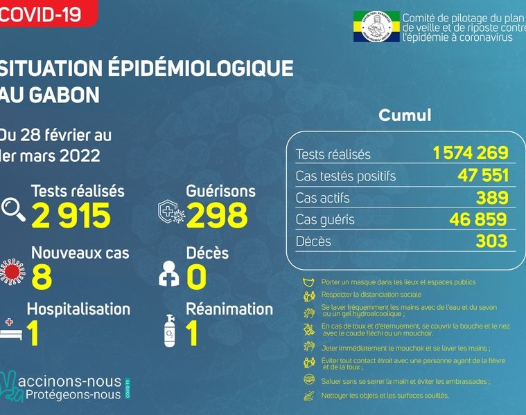 GabonMatin vous livre le point journalier du Comité de pilotage du plan de veille et de riposte contre l’épidémie à Coronavirus au Gabon du 1er mars 2022.