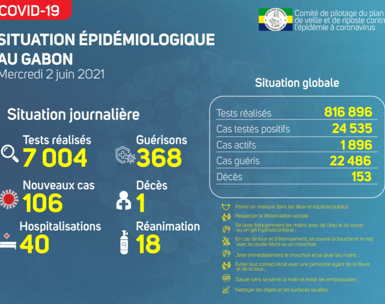 Gabon Matin vous livre le point journalier du Comité de pilotage du plan de veille et de riposte contre l’épidémie à Coronavirus au Gabon du 2 juin 2021.