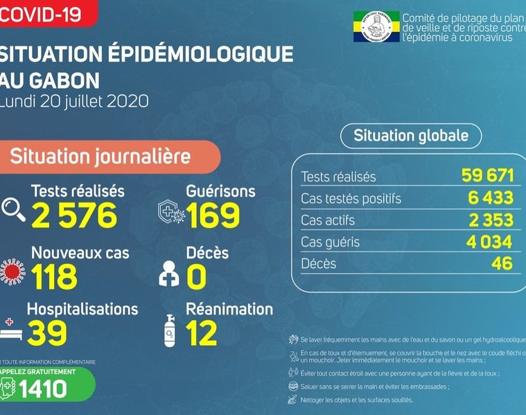 Gabon Matin vous livre le point journalier du Comité de pilotage du plan de veille et de riposte contre l’épidémie à Coronavirus au Gabon du 20 juillet 2020.