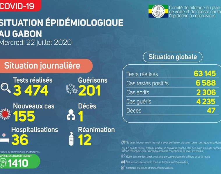 Gabon Matin vous livre le point journalier du Comité de pilotage du plan de veille et de riposte contre l’épidémie à Coronavirus au Gabon du 22 juillet 2020.