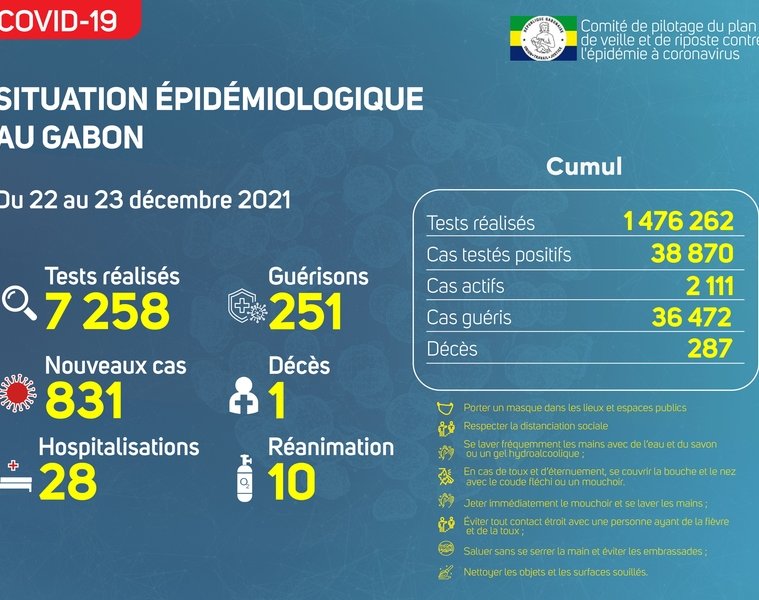 Gabon Matin vous livre le point journalier du Comité de pilotage du plan de veille et de riposte contre l’épidémie à Coronavirus au Gabon du 23 décembre 2021.