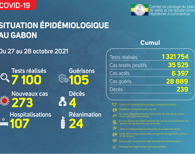 Nous avons enregistré 273 nouveaux cas positifs sur 7 100 tests réalisés, soit un taux de positivité de 3.8%, 107 personnes hospitalisées dont 24 en réanimation pour détresse respiratoire, 105 nouvelles guérisons et 04 nouveaux décès à Libreville.