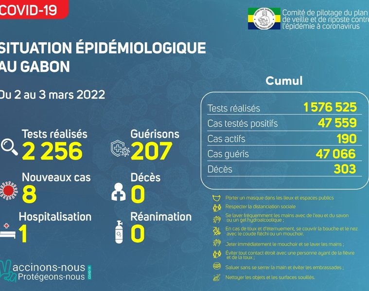 GabonMatin vous livre le point journalier du Comité de pilotage du plan de veille et de riposte contre l’épidémie à Coronavirus au Gabon du 3 mars 2022.