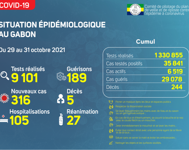 Gabon Matin vous livre le point journalier du Comité de pilotage du plan de veille et de riposte contre l’épidémie à Coronavirus au Gabon du 31 octobre 2021.