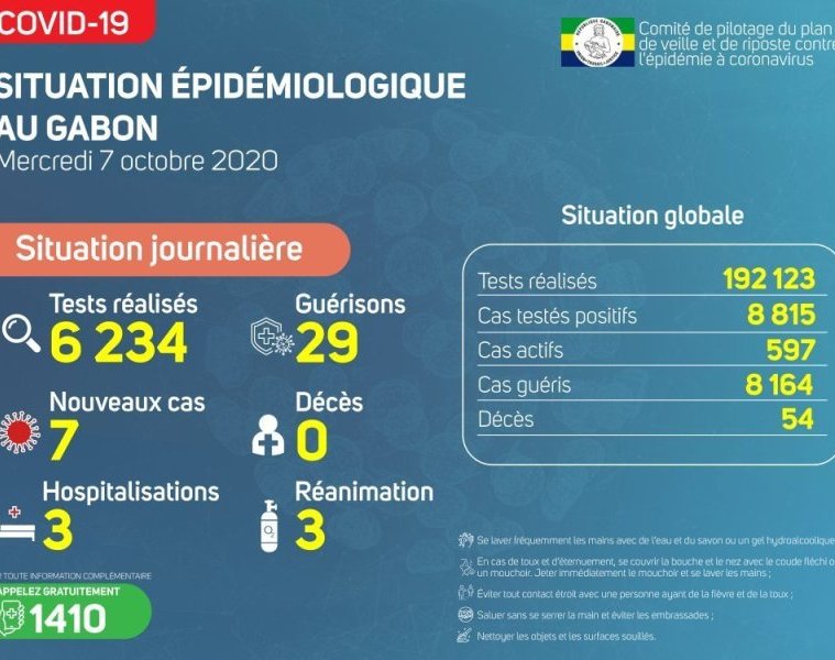 Gabon Matin vous livre le point journalier du Comité de pilotage du plan de veille et de riposte contre l’épidémie à Coronavirus au Gabon du 7 octobre 2020.
