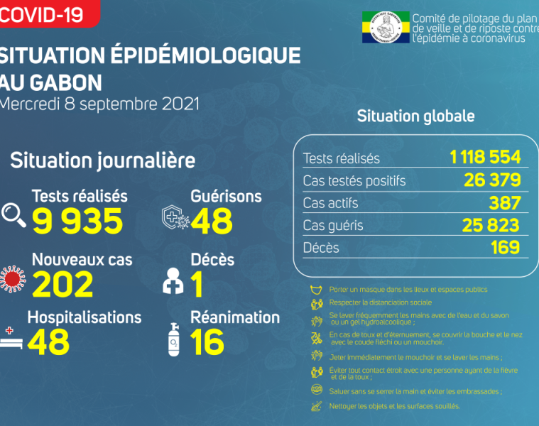 Nous avons enregistré 202 nouveaux cas positifs sur 9 935 tests réalisés, soit un taux de positivité de 2%, 48 personnes hospitalisées dont 16 en réanimation pour détresse respiratoire, 48 nouvelles guérisons et 01 nouveau décès à Libreville.