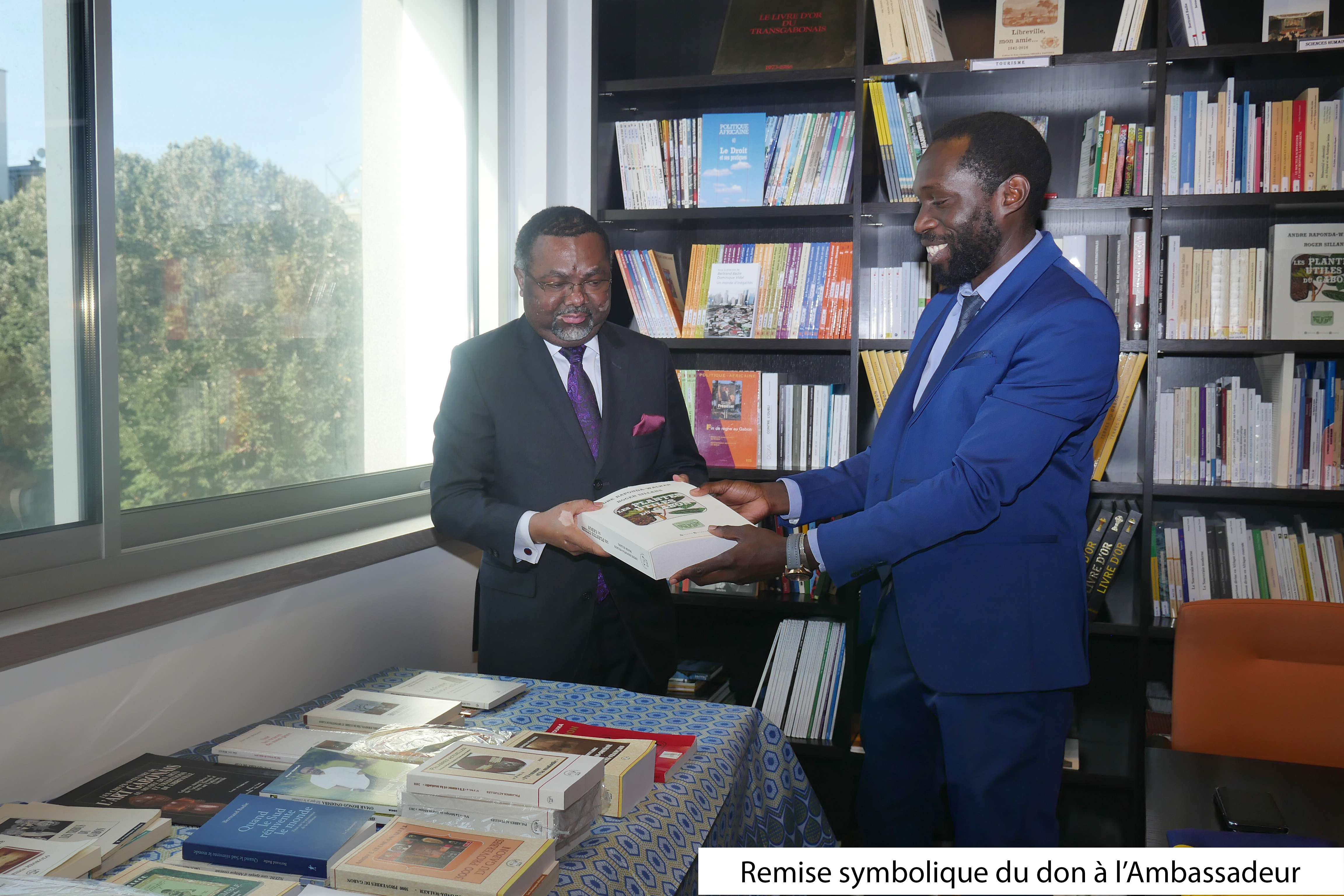Composé d’une trentaine de livres sur le Gabon, ce don vient enrichir le fonds Gabon de la Bibliothèque. S’exprimant au nom du Bureau et des membres de l’Association, le Président a inscrit ce don dans « le registre de la contribution patriotique à la promotion de la culture gabonaise et de l’encouragement de l’initiative des autorités gabonaises qui a consisté à créer une bibliothèque au sein de l’Ambassade ».