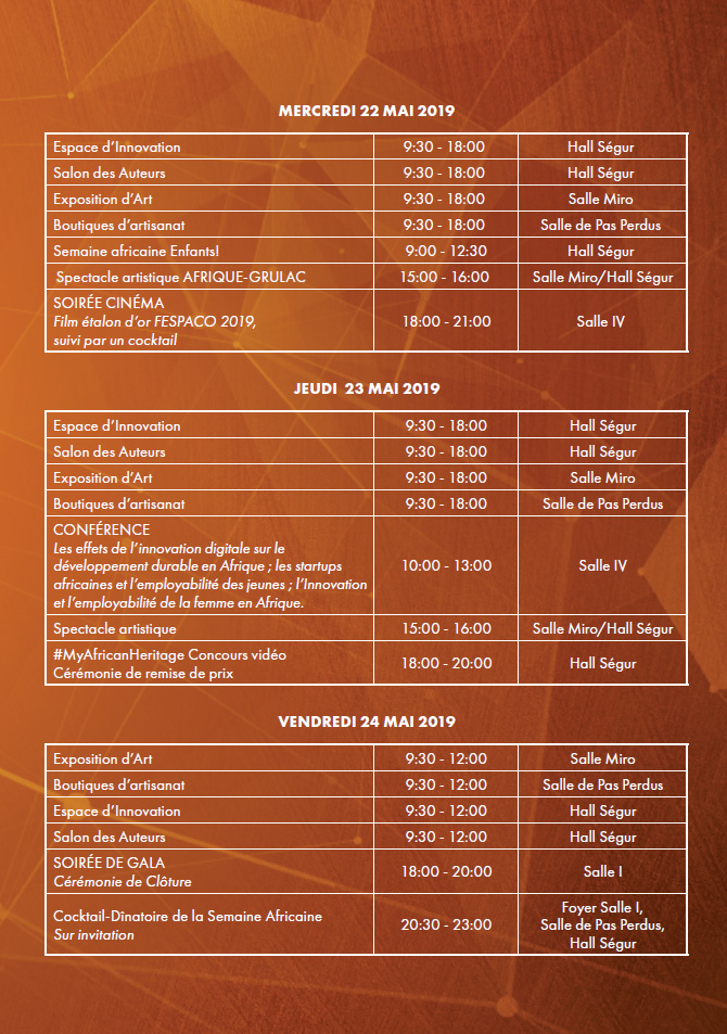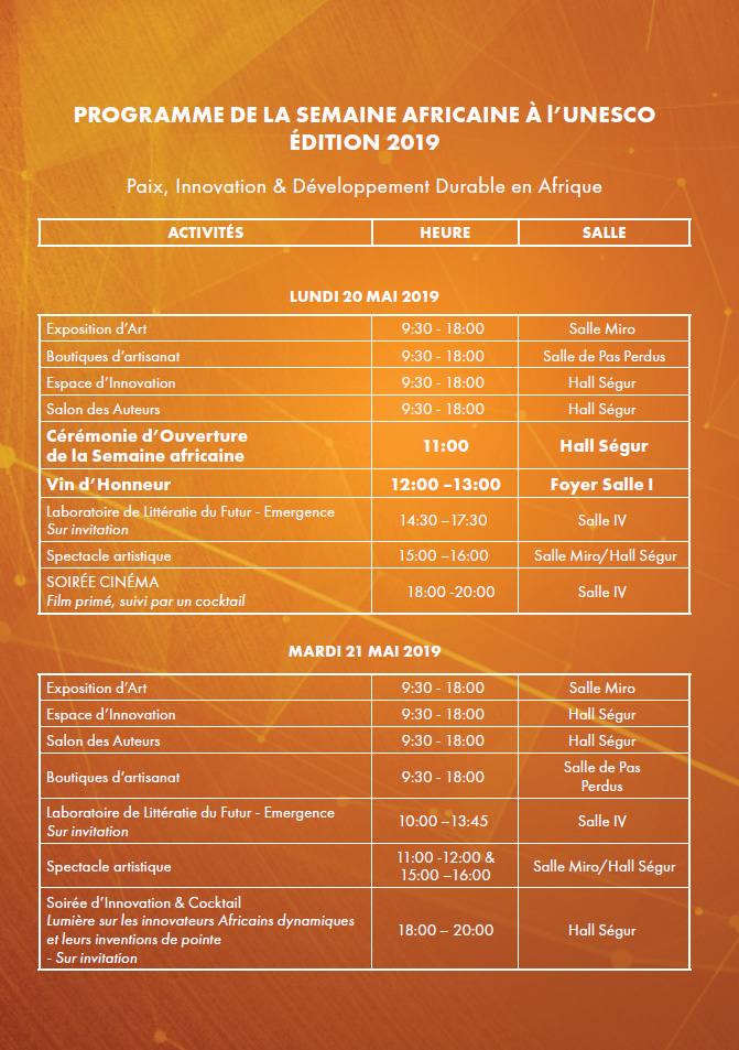 La Semaine africaine, qui se déroulera du 20 au 24 mai, aura à son ouverture la présence d’Audrey Azoulay, directrice générale de l’UNESCO, ainsi que les ambassadeurs auprès de l’UNESCO, différents dignitaires africains, représentants du monde des affaires et du monde universitaire et étudiants et accueillera un pôle d’innovation qui permettra à plusieurs inventeurs africains de présenter leurs projets à la pointe de la technologie.