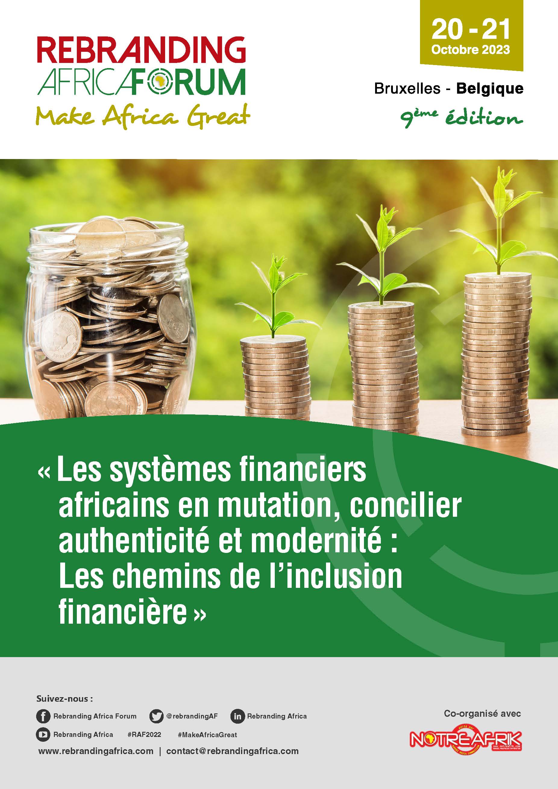 Lancée en 2014, la 9e édition du Rebranding Africa Forum (RAF) attend du beau monde cette fin de semaine du 20 au 21 octobre à Bruxelles (Belgique). Considéré comme le plus grand forum économique en Belgique consacré à l’Afrique, l’évènement aura cette année pour thème : « Les systèmes financiers africains en mutation, concilier authenticité & modernité : les chemins de l’inclusion financière  ».