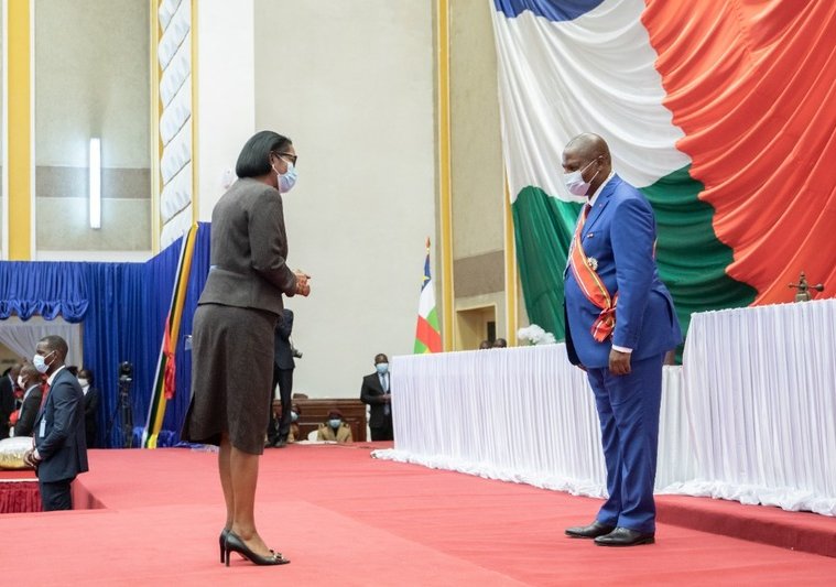 La Première ministre Rose Christiane Ossouka Raponda a représenté Ali Bongo lors de la cérémonie d’investiture du président de la République Centrafricaine, Archange Touadéra, qui s’est déroulée ce mardi 30 mars 2021 à Bangui.