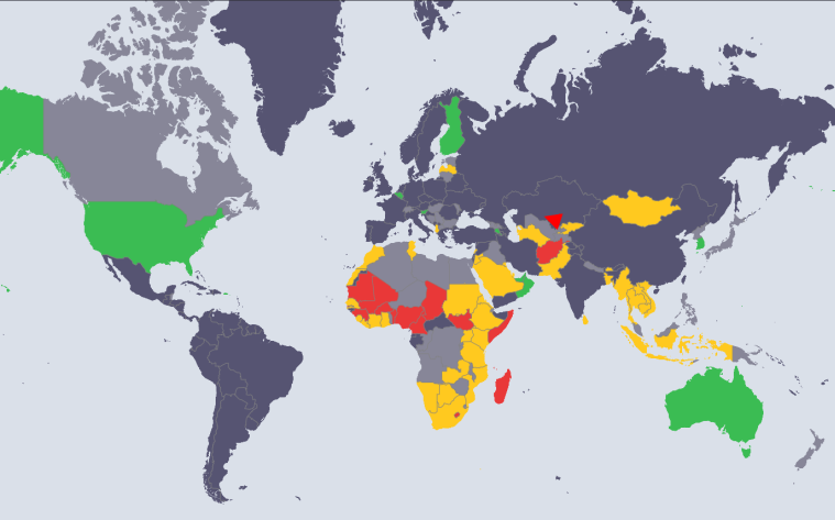 Quinze pays, indiqués en rouge, ont obtenu une note inférieure à 40 sur une échelle de 100 points : on considère donc qu’ils ne sont pas prêts. Quarante et un, en jaune, ont obtenu un score compris entre 40 et 79, tandis que les neuf pays en vert ont reçu au moins 80 points. La plupart des pays en jaune se trouvent en Afrique et en Asie, encore que certains dans ces endroits soient bien placés pour rejoindre le groupe des pays coloriés en vert, ajoute Mme McClelland. (Onze autres pays ont été évalués, mais leur note n’a pas encore été affichée.) Avec les informations qu’elle contient, la carte attire l’attention sur les moyens d’améliorer son score.