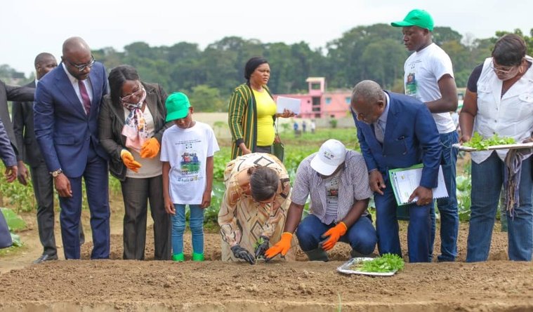 Pour clore cette cérémonie de lancement de l’édition 2019 des vacances agricoles, Mesdames Sylvia Bongo Ondimba et Augustine Nkoghe Bekale accompagnées du ministre Biendi Maganga Moussavou et des vacanciers ont pris part à deux activités de planting et de récolte de laitue.